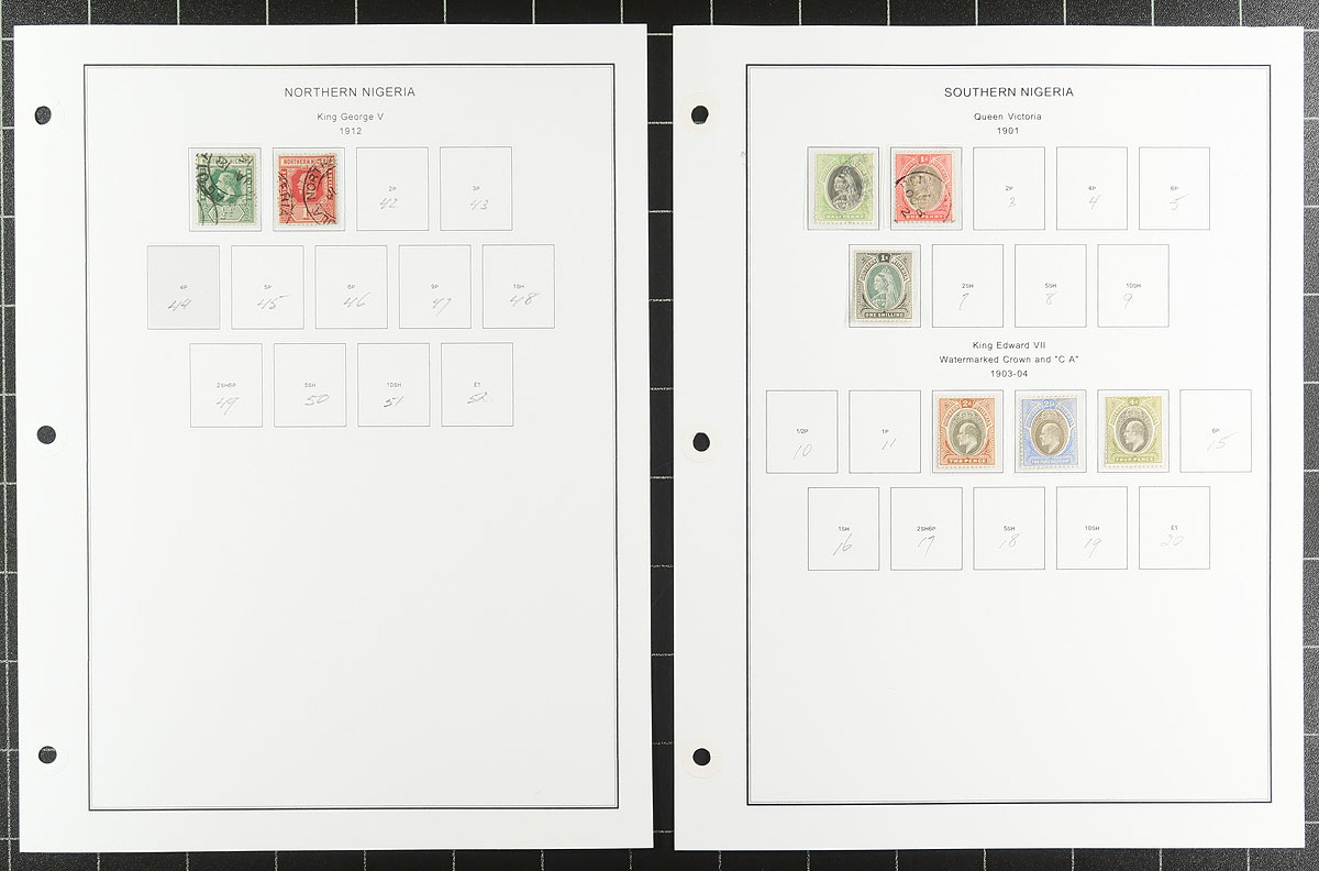 Nice collection of mint and used Nigeria, 1882-1971, containing a few hundred stamps in mostly well organized computerized album pages and a few stock pages. The lot generally ranges from Scott #1/264, along with selections of Lagos, Niger Coast Protectorate, and Northern and Southern Nigeria, which include singles, sets, and partial sets, with some cataloguing $10 to $20 and up, including mint Omnibus sets and more. Owner's 2019 Scott catalogue value for the collection totals US$566.95. A nice starter collection of this very interesting area of philately. Estimate =