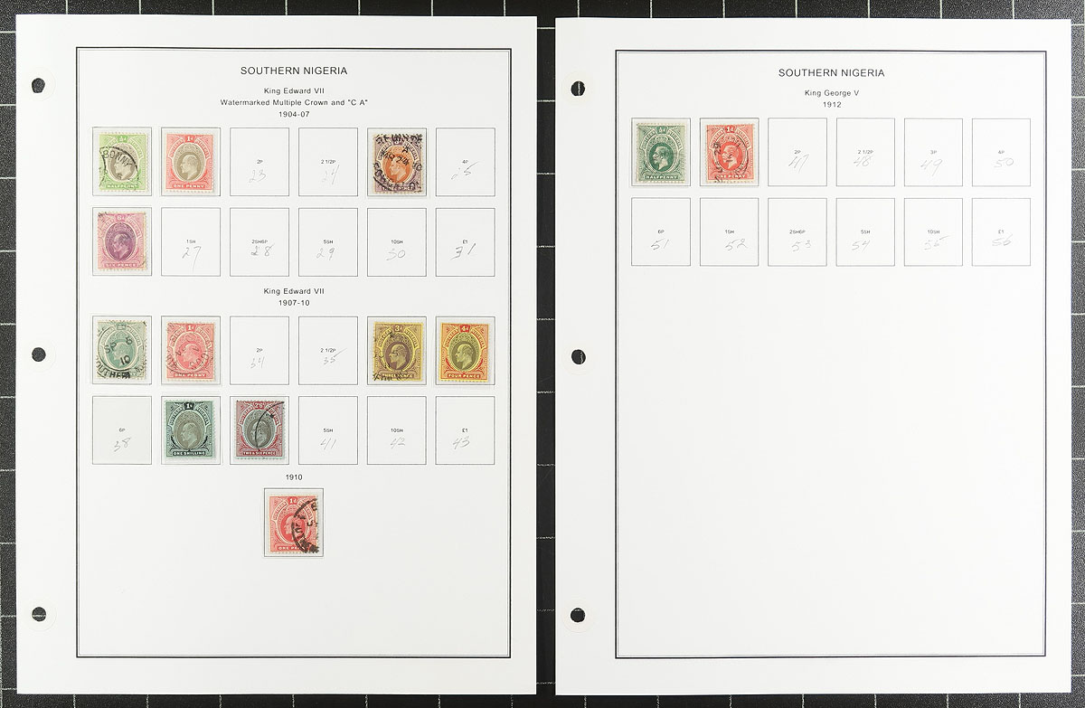 Nice collection of mint and used Nigeria, 1882-1971, containing a few hundred stamps in mostly well organized computerized album pages and a few stock pages. The lot generally ranges from Scott #1/264, along with selections of Lagos, Niger Coast Protectorate, and Northern and Southern Nigeria, which include singles, sets, and partial sets, with some cataloguing $10 to $20 and up, including mint Omnibus sets and more. Owner's 2019 Scott catalogue value for the collection totals US$566.95. A nice starter collection of this very interesting area of philately. Estimate =