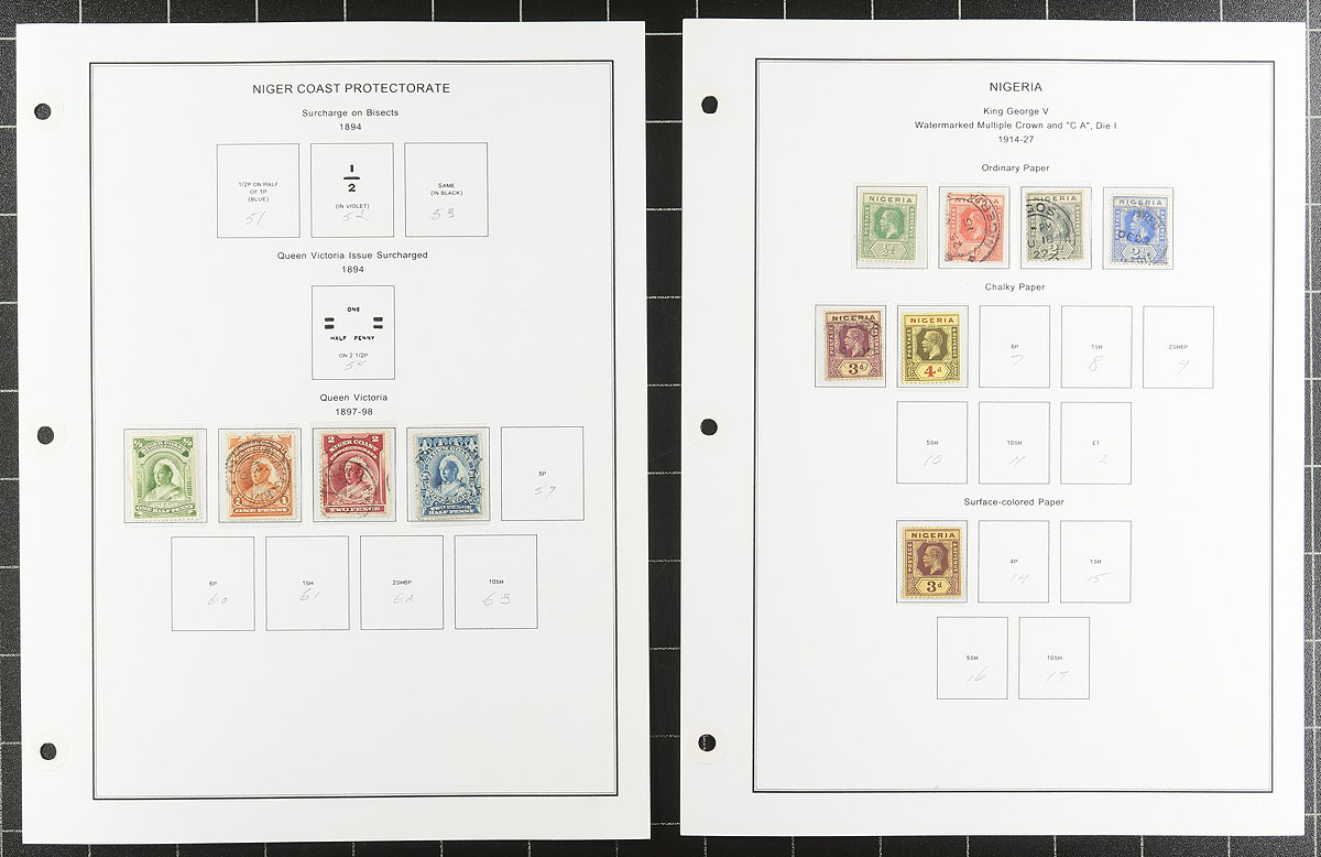 Nice collection of mint and used Nigeria, 1882-1971, containing a few hundred stamps in mostly well organized computerized album pages and a few stock pages. The lot generally ranges from Scott #1/264, along with selections of Lagos, Niger Coast Protectorate, and Northern and Southern Nigeria, which include singles, sets, and partial sets, with some cataloguing $10 to $20 and up, including mint Omnibus sets and more. Owner's 2019 Scott catalogue value for the collection totals US$566.95. A nice starter collection of this very interesting area of philately. Estimate =