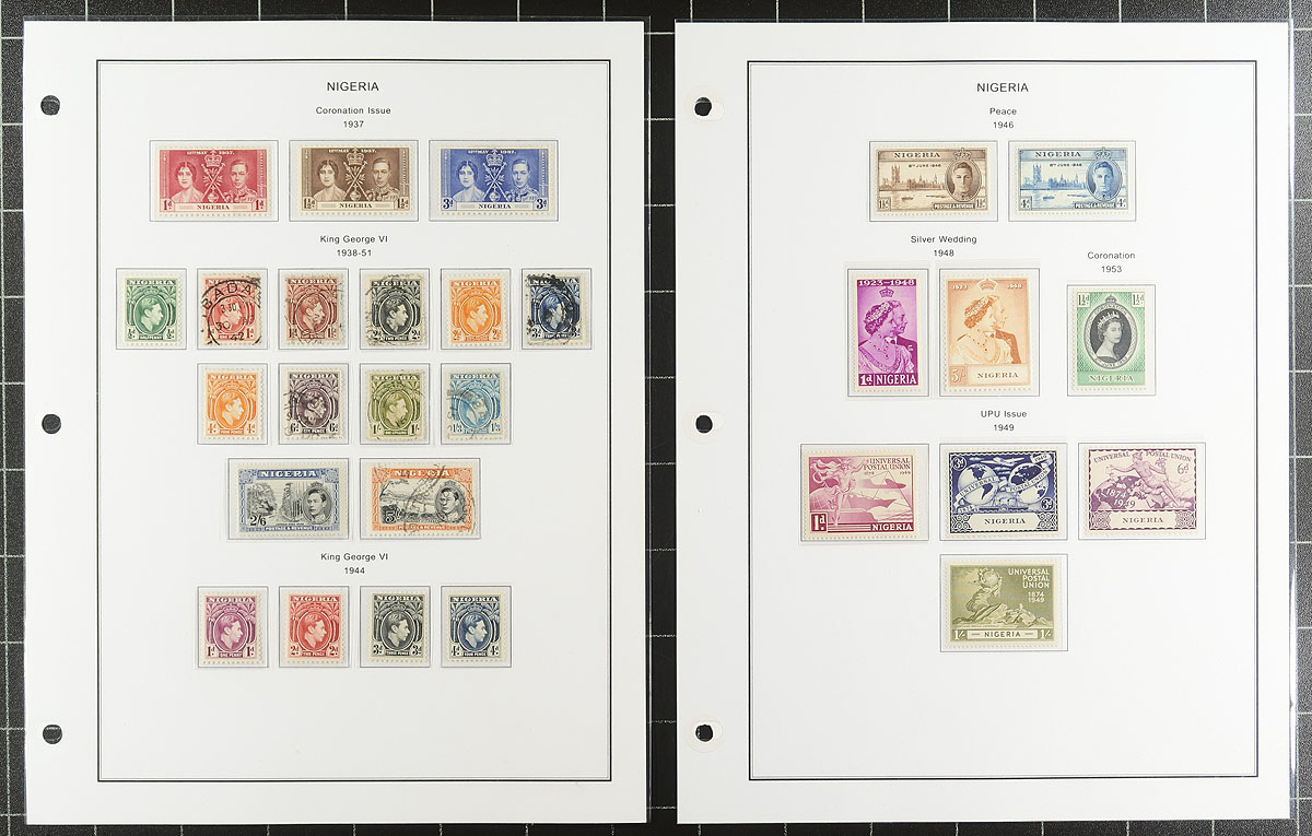 Nice collection of mint and used Nigeria, 1882-1971, containing a few hundred stamps in mostly well organized computerized album pages and a few stock pages. The lot generally ranges from Scott #1/264, along with selections of Lagos, Niger Coast Protectorate, and Northern and Southern Nigeria, which include singles, sets, and partial sets, with some cataloguing $10 to $20 and up, including mint Omnibus sets and more. Owner's 2019 Scott catalogue value for the collection totals US$566.95. A nice starter collection of this very interesting area of philately. Estimate =