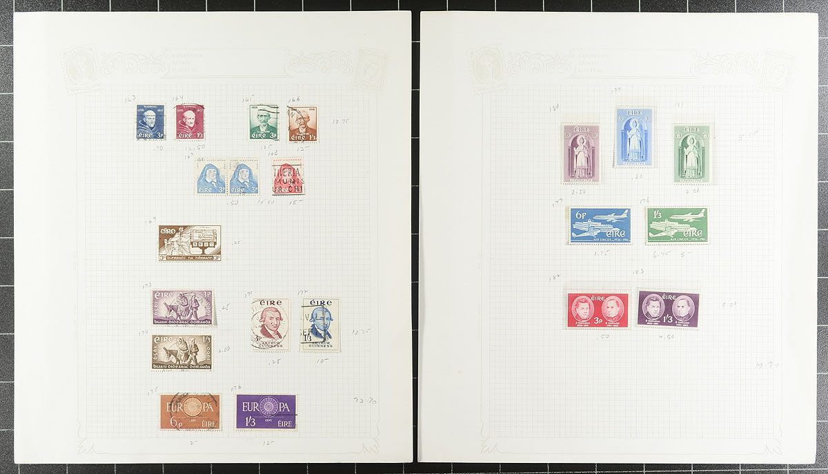 Collection / accumulation of primarily used Ireland, 1922-2001, containing a few thousand stamps in several album and stock pages. The lot generally ranges from Scott #1/1319B, containing singles and several sets, along with some back of the book issues. A spot check indicated some sets cataloguing $10 to $20 each, with the owner's 2015 Scott catalogue value totaling US$1,155.00, leaving potential finds for dedicated collectors. Overall fine to very fine. Estimate =