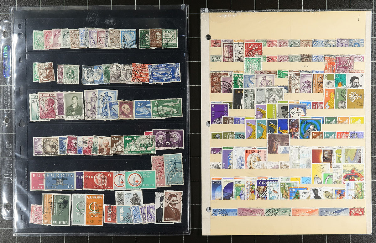 Collection / accumulation of primarily used Ireland, 1922-2001, containing a few thousand stamps in several album and stock pages. The lot generally ranges from Scott #1/1319B, containing singles and several sets, along with some back of the book issues. A spot check indicated some sets cataloguing $10 to $20 each, with the owner's 2015 Scott catalogue value totaling US$1,155.00, leaving potential finds for dedicated collectors. Overall fine to very fine. Estimate =