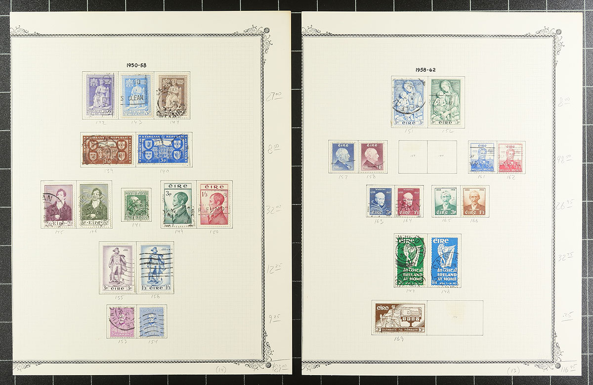 Collection / accumulation of primarily used Ireland, 1922-2001, containing a few thousand stamps in several album and stock pages. The lot generally ranges from Scott #1/1319B, containing singles and several sets, along with some back of the book issues. A spot check indicated some sets cataloguing $10 to $20 each, with the owner's 2015 Scott catalogue value totaling US$1,155.00, leaving potential finds for dedicated collectors. Overall fine to very fine. Estimate =