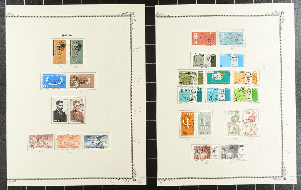 Collection / accumulation of primarily used Ireland, 1922-2001, containing a few thousand stamps in several album and stock pages. The lot generally ranges from Scott #1/1319B, containing singles and several sets, along with some back of the book issues. A spot check indicated some sets cataloguing $10 to $20 each, with the owner's 2015 Scott catalogue value totaling US$1,155.00, leaving potential finds for dedicated collectors. Overall fine to very fine. Estimate =