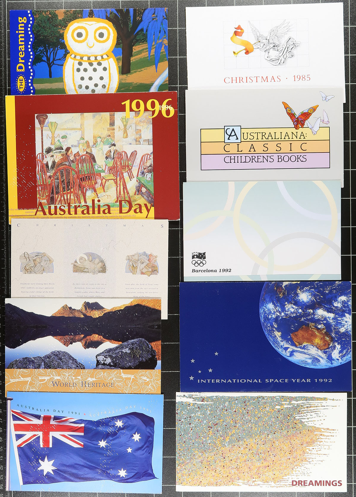 Nice group of Australia post office presentation packs, 1970's-1990's, containing just over 100 in totals noting singles, several sets, and a few souvenir sheets, including the "Australian Bicentennial Collection". A clean lot especially for topical and thematic collectors as we encountered several suitable subjects, or for dealers looking for stock. Face value is at least a few hundred dollars and well worth our low estimate. Estimate =