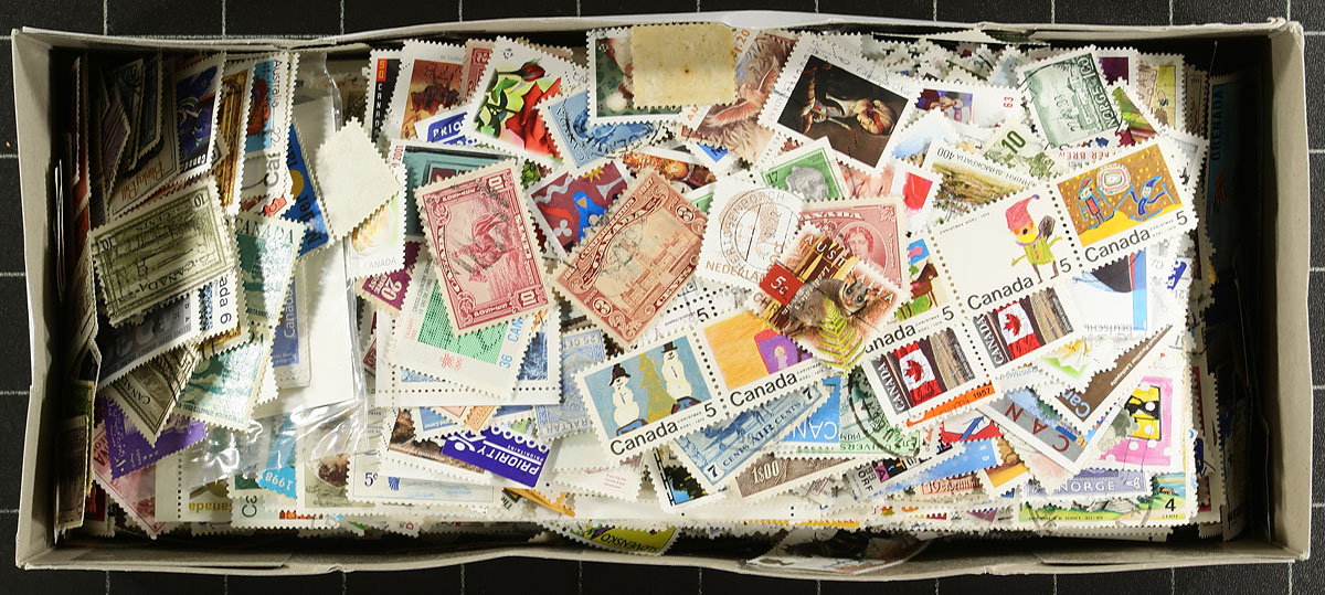 Consignment remainders of worldwide material, containing thousands of stamps in two binders, two shoeboxes, and a few other items. The binders contain nicely organized used Great Britain, with the first having material ranging from Scott #151/220 noting duplication up to 20 for most issues, and unchecked for varieties etc., (owner's 2019 Scott catalogue value for the binder totals $1,612.75). The second binder contains a nice selection of used Machins, and the shoe boxes having over 8,000 stamps generally ranging from the 1930s to the 1980s. The lot also contains a group of glassines and two literature items. A good project for the worldwide collector. Estimate =