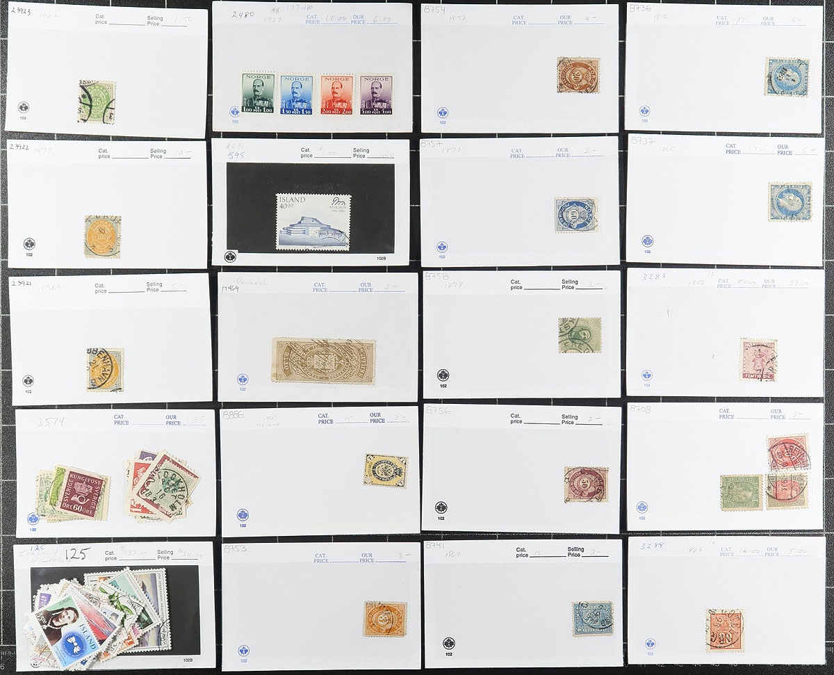 Scandinavia. Group of primarily used Scandinavia in 100x dealer "102" cards, noting better representation from Sweden and Denmark, primarily one stamp per card, generally ranging from the 1880's to the 1950's (with a few modern stamps noted). Each card has been priced for retail, with most cards priced from $5 to $20 each, with a total retail value for the lot totaling $595 (catalogue price would generally be higher). A nice lot with some better stamps within and ideal for the Scandinavia or worldwide collector. Estimate =