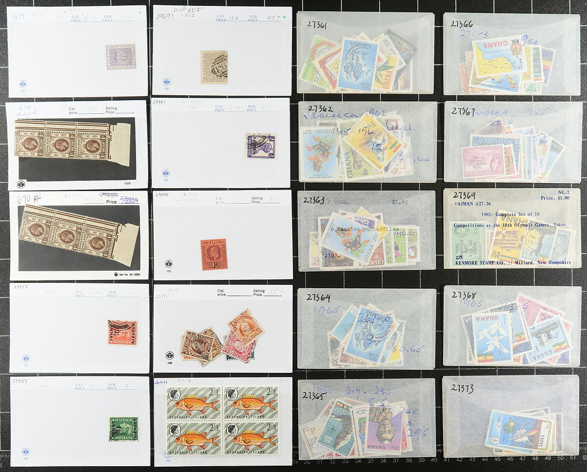 British Commonwealth. Group of mint and used stamps in roughly 90x dealer "102" cards and glassines, with material generally ranging from the 1880's to the 1970's. We note better representation from Australia, New Zealand, and area, Malta, and a few other regions. Most of the cards have been priced for retail with cards generally priced from $3 to $20 each. A useful lot for collectors alike, overall fine to very fine. Estimate =
