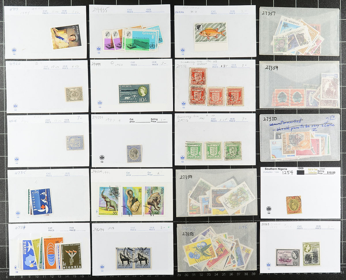 British Commonwealth. Group of mint and used stamps in roughly 90x dealer "102" cards and glassines, with material generally ranging from the 1880's to the 1970's. We note better representation from Australia, New Zealand, and area, Malta, and a few other regions. Most of the cards have been priced for retail with cards generally priced from $3 to $20 each. A useful lot for collectors alike, overall fine to very fine. Estimate =