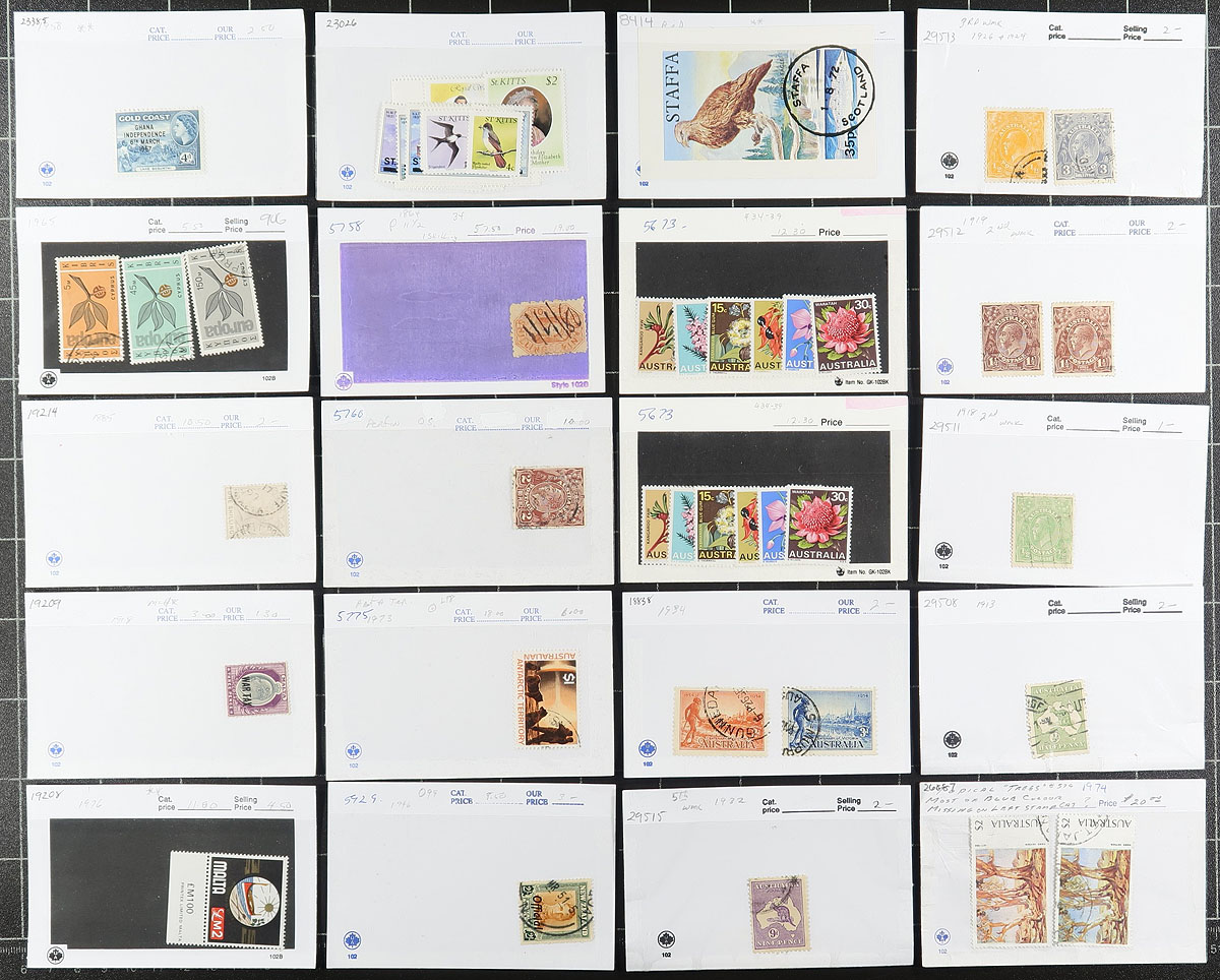 British Commonwealth. Group of mint and used stamps in roughly 90x dealer "102" cards and glassines, with material generally ranging from the 1880's to the 1970's. We note better representation from Australia, New Zealand, and area, Malta, and a few other regions. Most of the cards have been priced for retail with cards generally priced from $3 to $20 each. A useful lot for collectors alike, overall fine to very fine. Estimate =