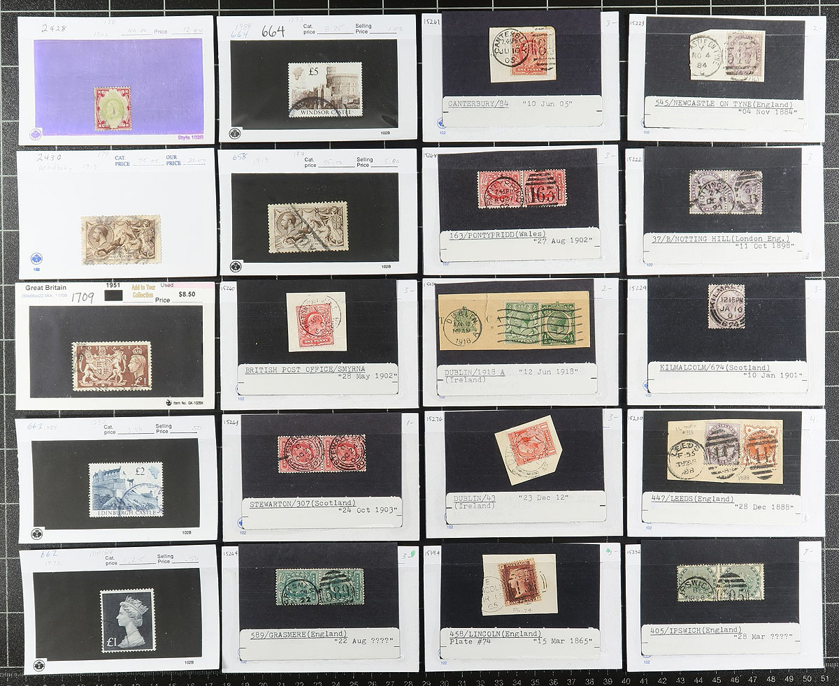 Group of primarily used Great Britain in roughly 100x dealer "102" cards, with material generally ranging from the 1850's to the 1960's. The cards generally contain one stamp per card, noting primarily Victorian and Edward VII issues (several different issues), a few Seahorse, QEII Castles, a few 1960's sets, and some cards identifying various town cancels. Most cards are priced from $3 to $20 each, with a total retail price for the lot at $765. A nice lot which has a potentially high catalogue value, overall fine to very fine. Estimate =