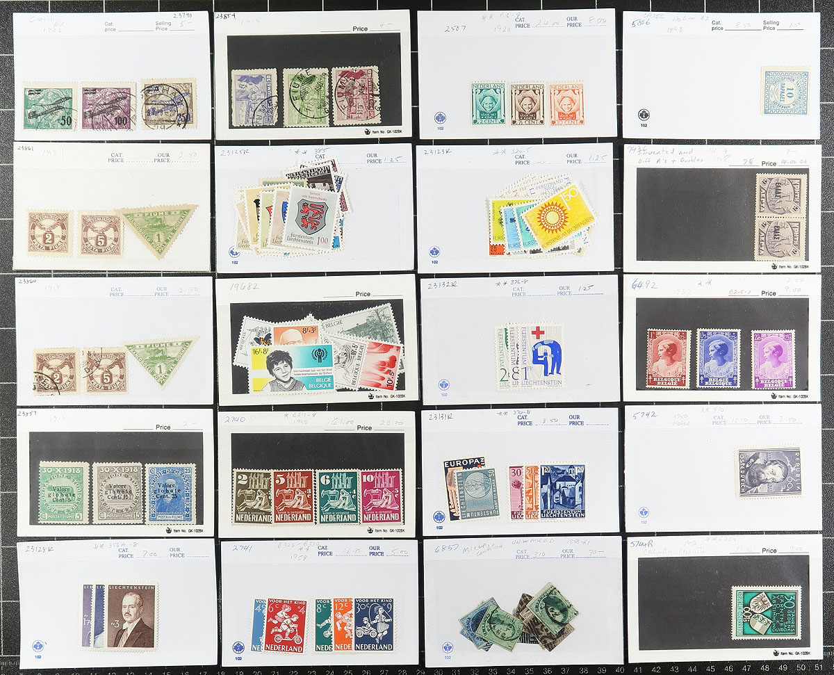 Europe. Group of primarily used Europe in roughly 125x dealer "102" cards, with material generally ranging from the 1880's to the 1960's. We note a mixture of classic used, with some mint sets of semi-postals and other singles, with better representation from France, Spain, Italy and Fiume, Austria, and a few other countries. Most of the cards retail from $2 to $20 each, with a total retail price at $675. A nice value lot for all collectors, overall fine to very fine. Estimate =