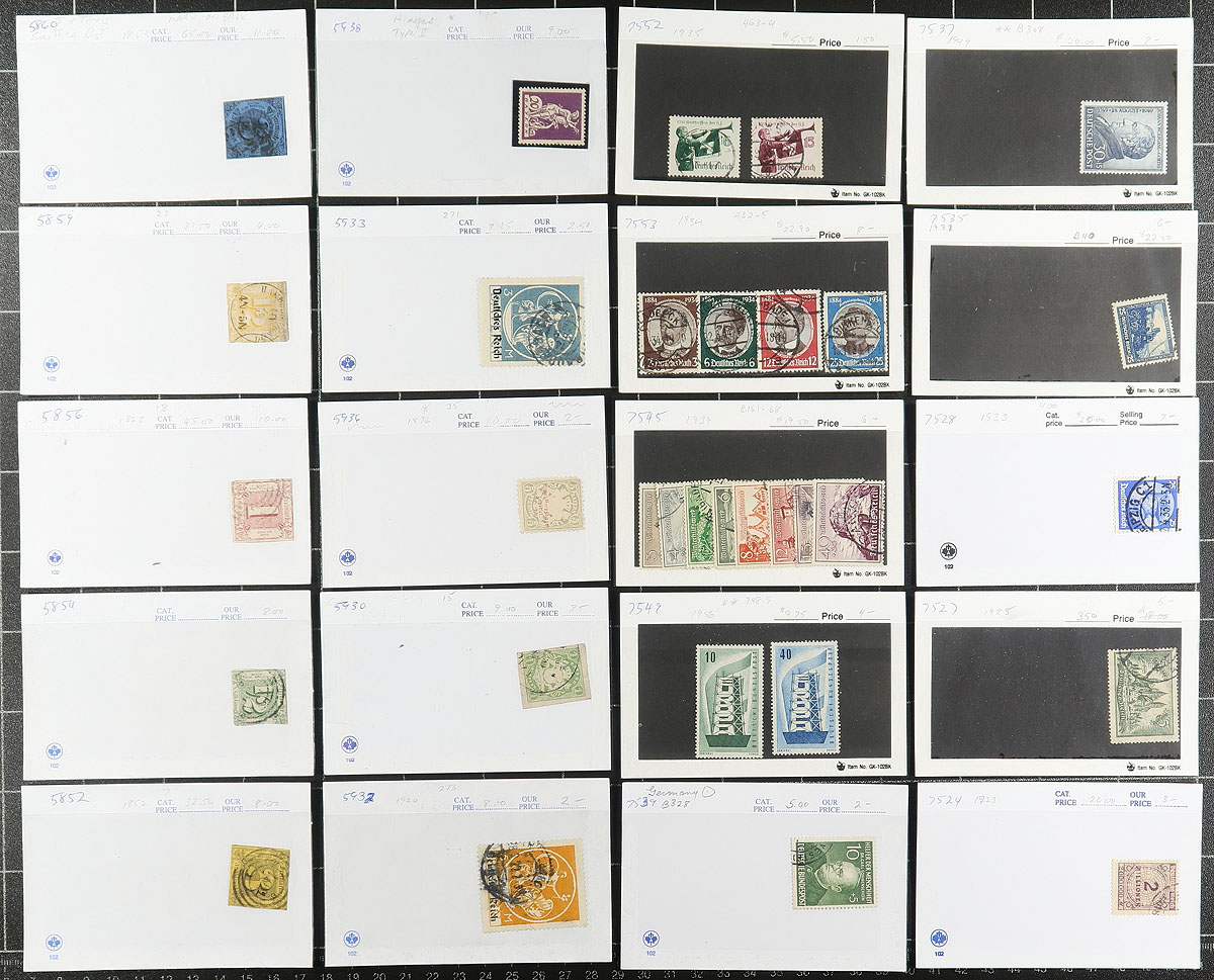 Group of primarily used Germany in roughly 100x dealer "102" cards, generally ranging from the 1870's to the 1970's. We note a mixture of material with classic used (including a few German States stamps), mint semi-postals, Berlin and DDR issues, and more. Most of the cards contain one stamp with retail pricing ranging from $2 to $20 per card, with a total of $484 for the lot. A nice little lot, unchecked for potential varieties or better postmarks, overall fine to very fine. Estimate =
