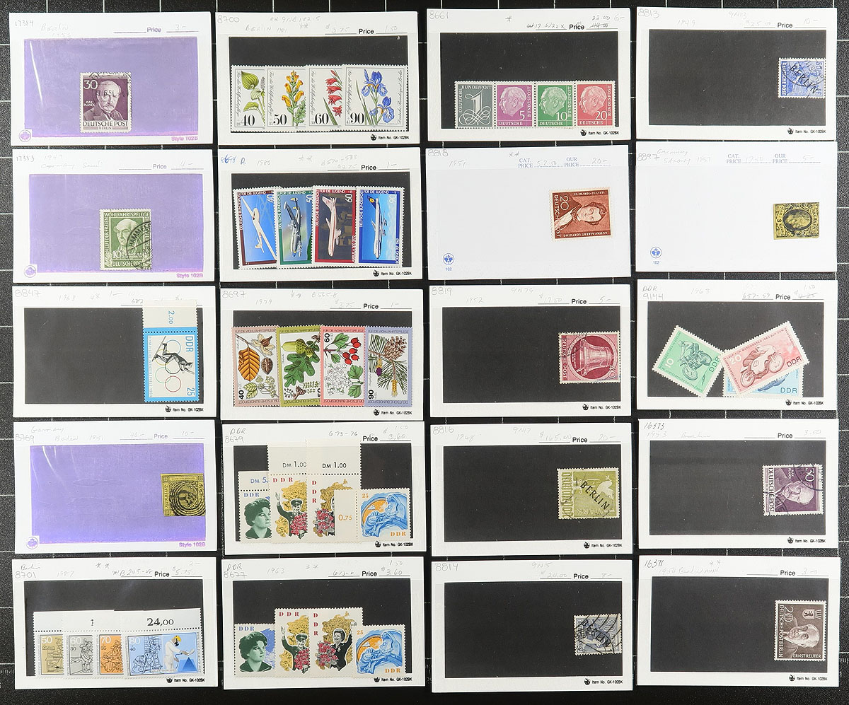 Group of primarily used Germany in roughly 100x dealer "102" cards, generally ranging from the 1870's to the 1970's. We note a mixture of material with classic used (including a few German States stamps), mint semi-postals, Berlin and DDR issues, and more. Most of the cards contain one stamp with retail pricing ranging from $2 to $20 per card, with a total of $484 for the lot. A nice little lot, unchecked for potential varieties or better postmarks, overall fine to very fine. Estimate =