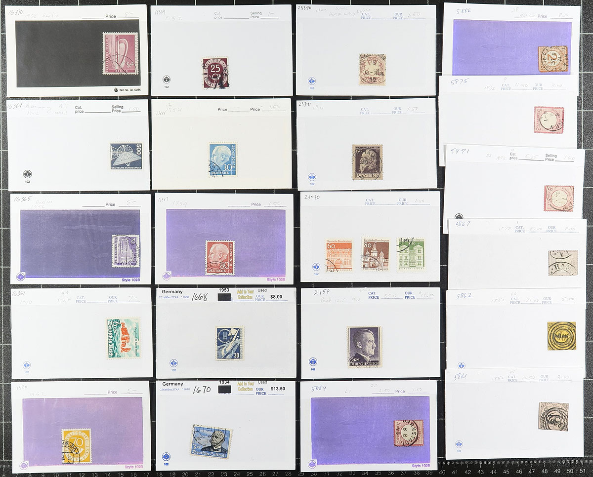 Group of primarily used Germany in roughly 100x dealer "102" cards, generally ranging from the 1870's to the 1970's. We note a mixture of material with classic used (including a few German States stamps), mint semi-postals, Berlin and DDR issues, and more. Most of the cards contain one stamp with retail pricing ranging from $2 to $20 per card, with a total of $484 for the lot. A nice little lot, unchecked for potential varieties or better postmarks, overall fine to very fine. Estimate =