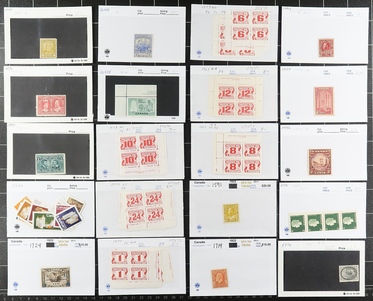 Group of mint Canada in roughly 100x dealer "102" cards, generally ranging from 1900's to the 1970's. We note a bit of everything including singles, a few sets, coils, and back of the book material, with strength from the Admirals to the 1950s. Most of the cards retail from $4 to $20 each with a total of $715 for the lot. Almost all the material is hinged, with the odd never hinged stamp within. A nice lot for the Canada collector, overall fine to very fine. Estimate =