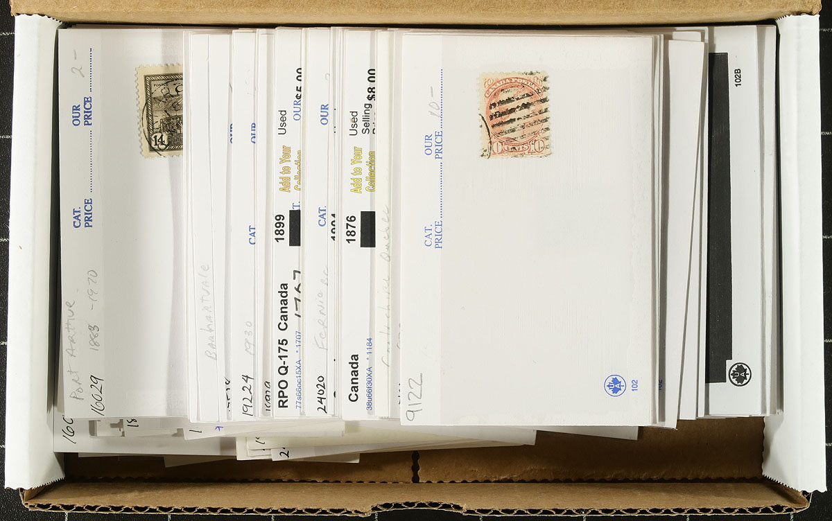 Group of used Canada in roughly 125x dealer "102" cards, generally ranging from the Large Queens to the 1960s. We note mostly singles, including a small selection of Small Queens, a few sets and blocks, with the majority of material from the 1890's to the 1950's. Most of the cards are priced ranging from $3 to $20 each with a total of $652 for the lot. A nice lot of used Canada, with some having 'sock on the nose' town postmarks. Estimate =