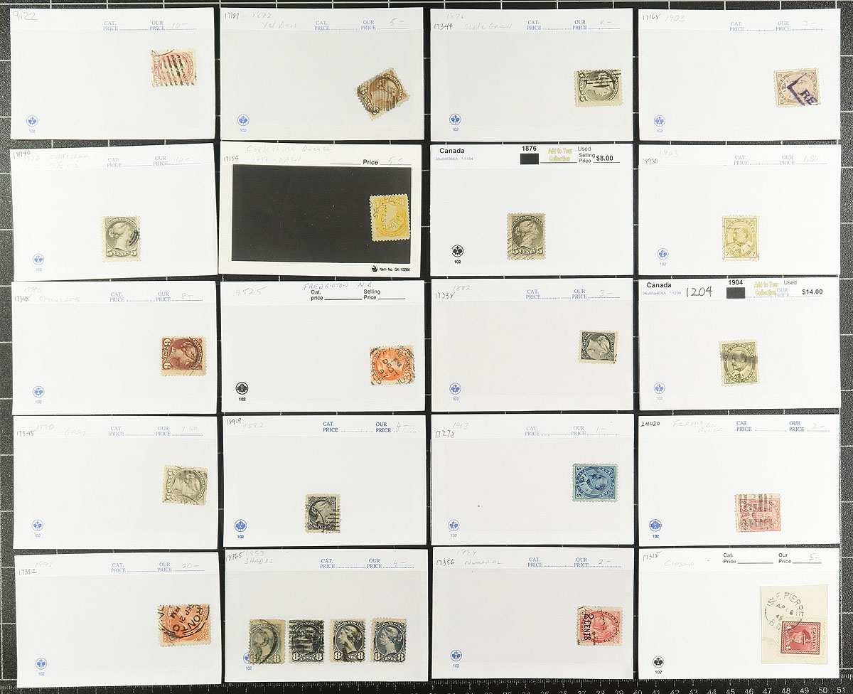 Group of used Canada in roughly 125x dealer "102" cards, generally ranging from the Large Queens to the 1960s. We note mostly singles, including a small selection of Small Queens, a few sets and blocks, with the majority of material from the 1890's to the 1950's. Most of the cards are priced ranging from $3 to $20 each with a total of $652 for the lot. A nice lot of used Canada, with some having 'sock on the nose' town postmarks. Estimate =