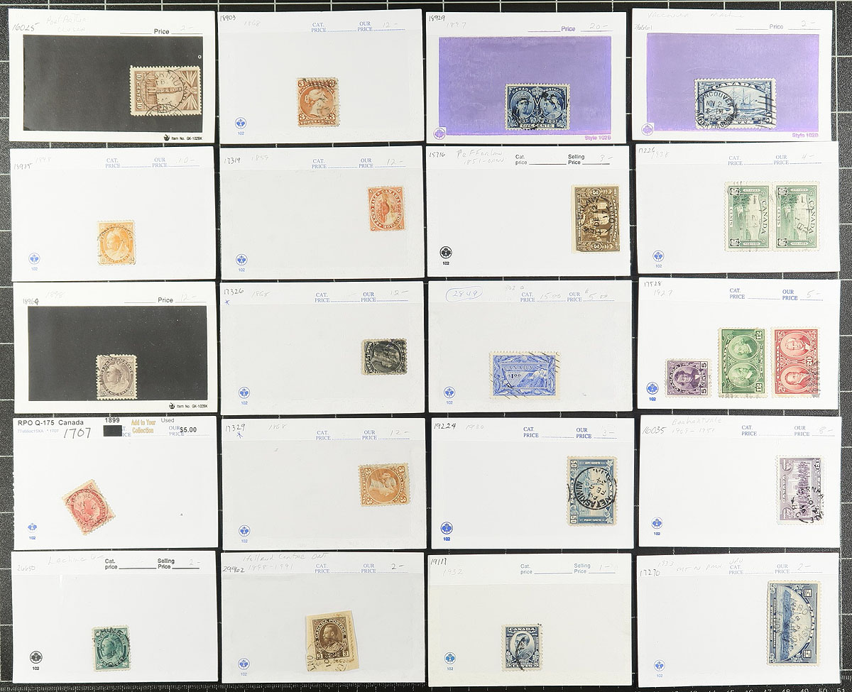 Group of used Canada in roughly 125x dealer "102" cards, generally ranging from the Large Queens to the 1960s. We note mostly singles, including a small selection of Small Queens, a few sets and blocks, with the majority of material from the 1890's to the 1950's. Most of the cards are priced ranging from $3 to $20 each with a total of $652 for the lot. A nice lot of used Canada, with some having 'sock on the nose' town postmarks. Estimate =