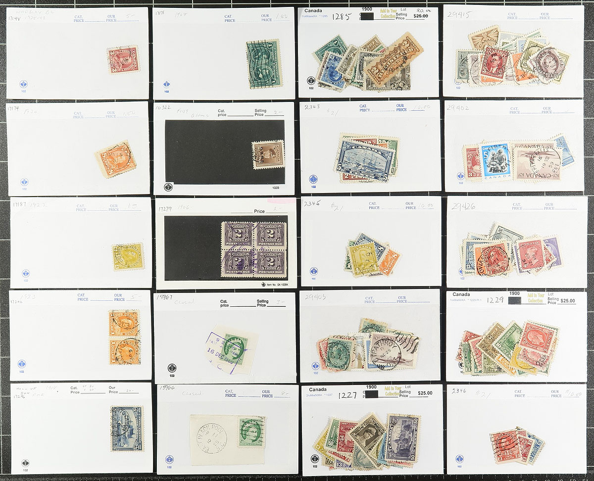 Group of used Canada in roughly 125x dealer "102" cards, generally ranging from the Large Queens to the 1960s. We note mostly singles, including a small selection of Small Queens, a few sets and blocks, with the majority of material from the 1890's to the 1950's. Most of the cards are priced ranging from $3 to $20 each with a total of $652 for the lot. A nice lot of used Canada, with some having 'sock on the nose' town postmarks. Estimate =