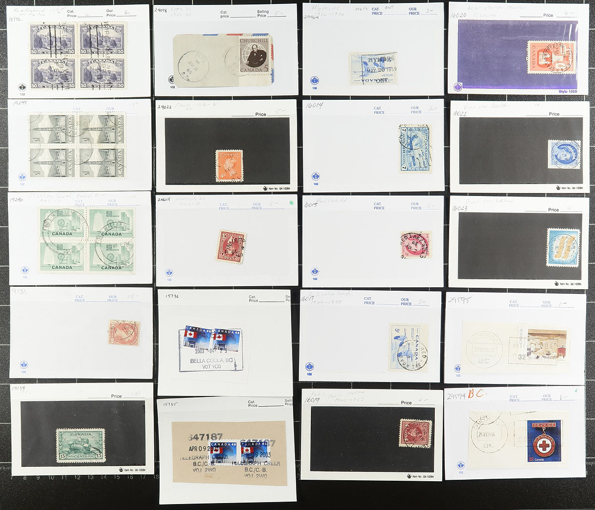 Group of used Canada in roughly 125x dealer "102" cards, generally ranging from the Large Queens to the 1960s. We note mostly singles, including a small selection of Small Queens, a few sets and blocks, with the majority of material from the 1890's to the 1950's. Most of the cards are priced ranging from $3 to $20 each with a total of $652 for the lot. A nice lot of used Canada, with some having 'sock on the nose' town postmarks. Estimate =