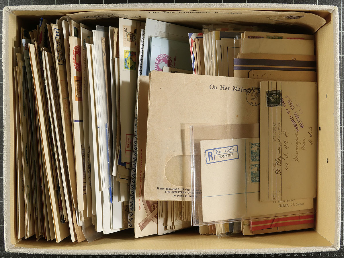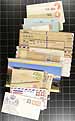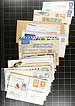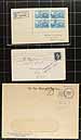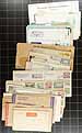 Small box of assorted covers, the balance of a local estate. Lots of postal stationery and 1930's-1940's cacheted First Day Covers, plus some interesting postal history, OHMS, philatelic exhibition items, etc. 200+ items here. Better includes a block of #C5 on registered cover. Offered as received. Estimate =