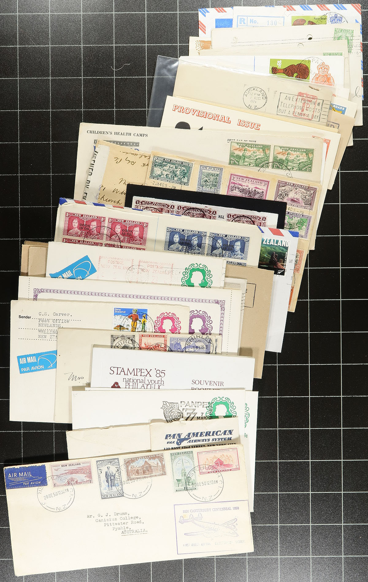 Small box of assorted covers, the balance of a local estate. Lots of postal stationery and 1930's-1940's cacheted First Day Covers, plus some interesting postal history, OHMS, philatelic exhibition items, etc. 200+ items here. Better includes a block of #C5 on registered cover. Offered as received. Estimate =