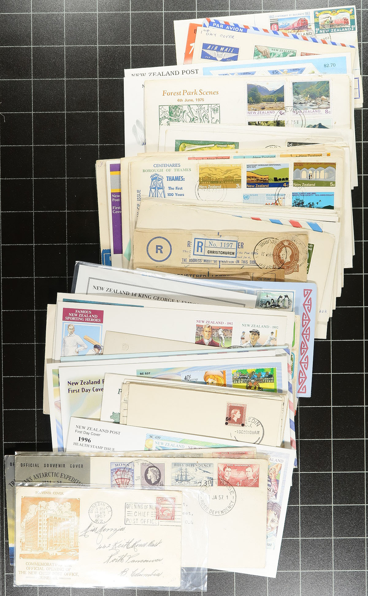 Small box of assorted covers, the balance of a local estate. Lots of postal stationery and 1930's-1940's cacheted First Day Covers, plus some interesting postal history, OHMS, philatelic exhibition items, etc. 200+ items here. Better includes a block of #C5 on registered cover. Offered as received. Estimate =