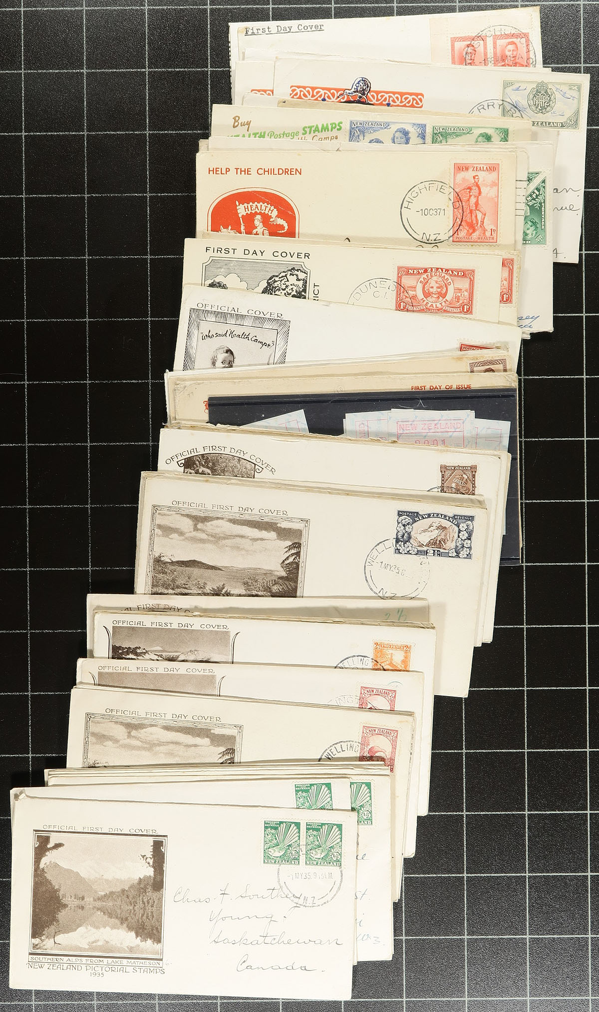 Small box of assorted covers, the balance of a local estate. Lots of postal stationery and 1930's-1940's cacheted First Day Covers, plus some interesting postal history, OHMS, philatelic exhibition items, etc. 200+ items here. Better includes a block of #C5 on registered cover. Offered as received. Estimate =