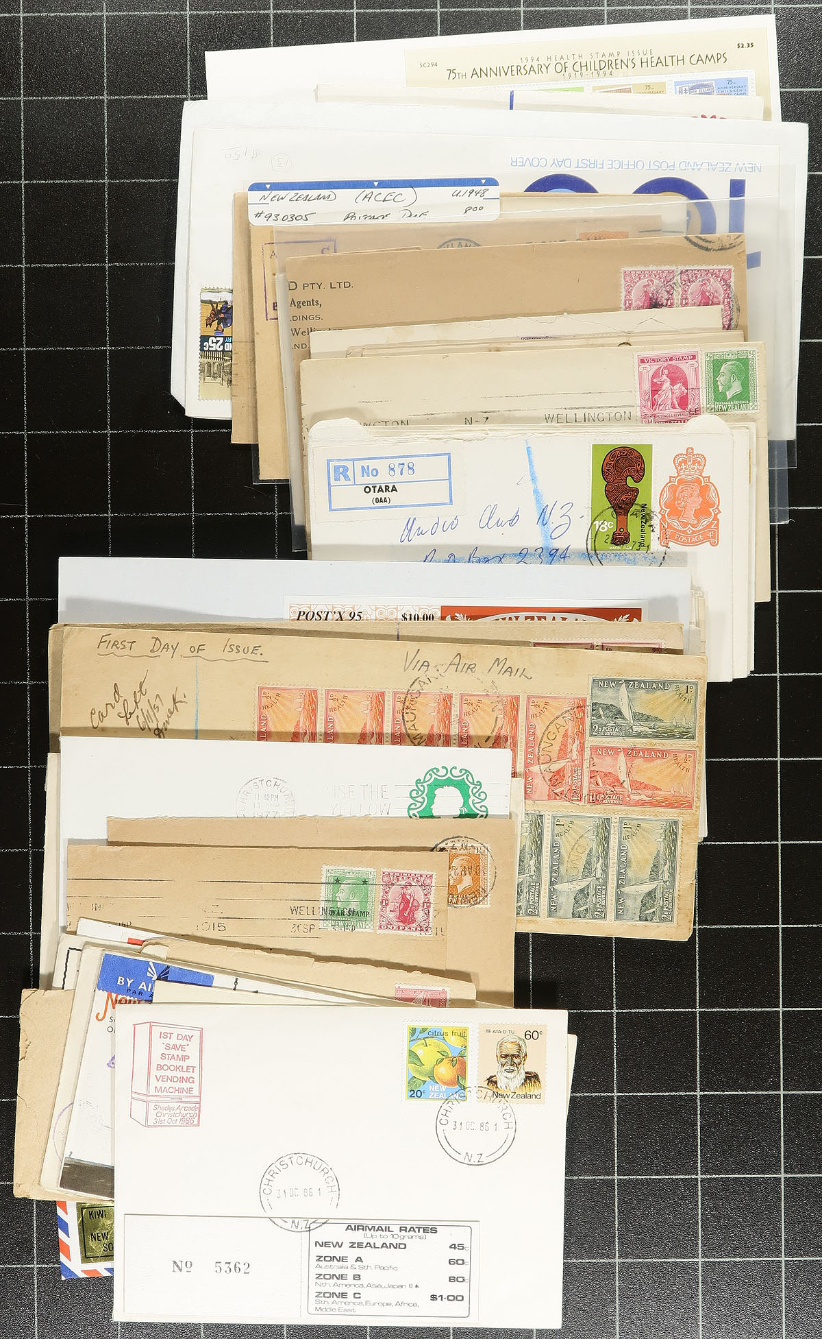 Small box of assorted covers, the balance of a local estate. Lots of postal stationery and 1930's-1940's cacheted First Day Covers, plus some interesting postal history, OHMS, philatelic exhibition items, etc. 200+ items here. Better includes a block of #C5 on registered cover. Offered as received. Estimate =