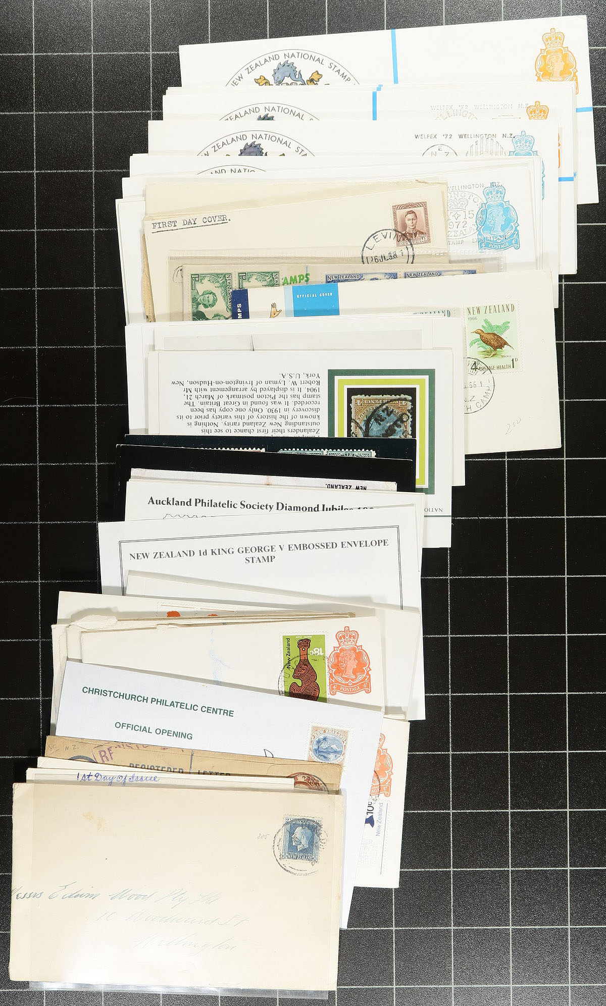 Small box of assorted covers, the balance of a local estate. Lots of postal stationery and 1930's-1940's cacheted First Day Covers, plus some interesting postal history, OHMS, philatelic exhibition items, etc. 200+ items here. Better includes a block of #C5 on registered cover. Offered as received. Estimate =