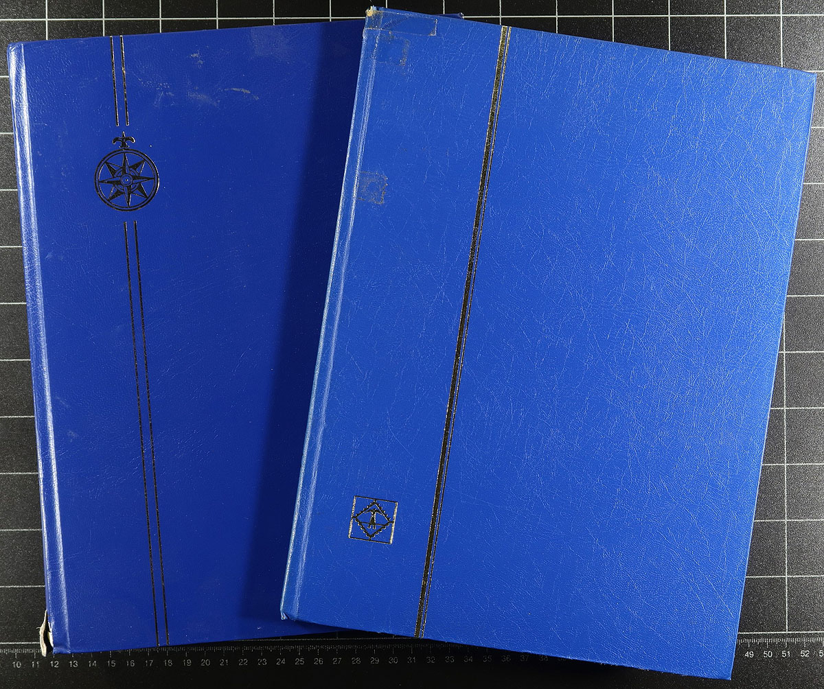 Supplies lot with two red "Lighthouse" three ring binders (and slip covers) in their original packaging, plus a couple of squatter, but thicker binders with slip covers (and a few black 2-pocket Vario pages). There are three mint sheet files and six assorted stockbooks (either Lighthouse or Uni-Safe) in varying sizes, colours and condition (at least two have a few stamps in them). Estimate =