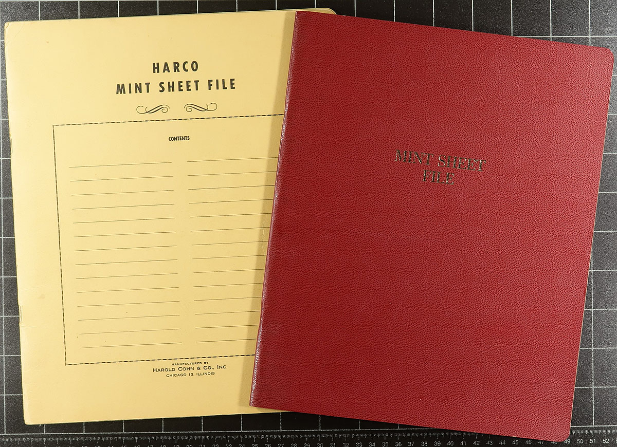 Supplies lot with two red "Lighthouse" three ring binders (and slip covers) in their original packaging, plus a couple of squatter, but thicker binders with slip covers (and a few black 2-pocket Vario pages). There are three mint sheet files and six assorted stockbooks (either Lighthouse or Uni-Safe) in varying sizes, colours and condition (at least two have a few stamps in them). Estimate =