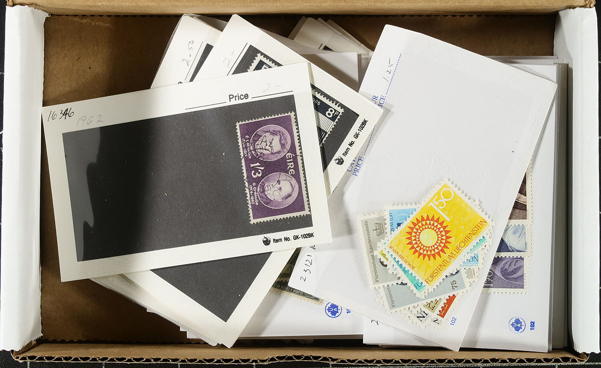 Group of primarily used worldwide stamps in roughly 100x dealer "102" cards, containing most singles and a few sets, generally ranging from the 1880's to the 1970's. The lot contains countries mostly in Europe, Middle East, and South America, noting France, Brazil, Germany, Iran, and some stamps from the United States. Most of the cards have been priced ranging from $2 to $20 per card, with a total retail value at $462 (roughly 80% of the cards have been priced). A nice lot for the worldwide collector. Estimate =