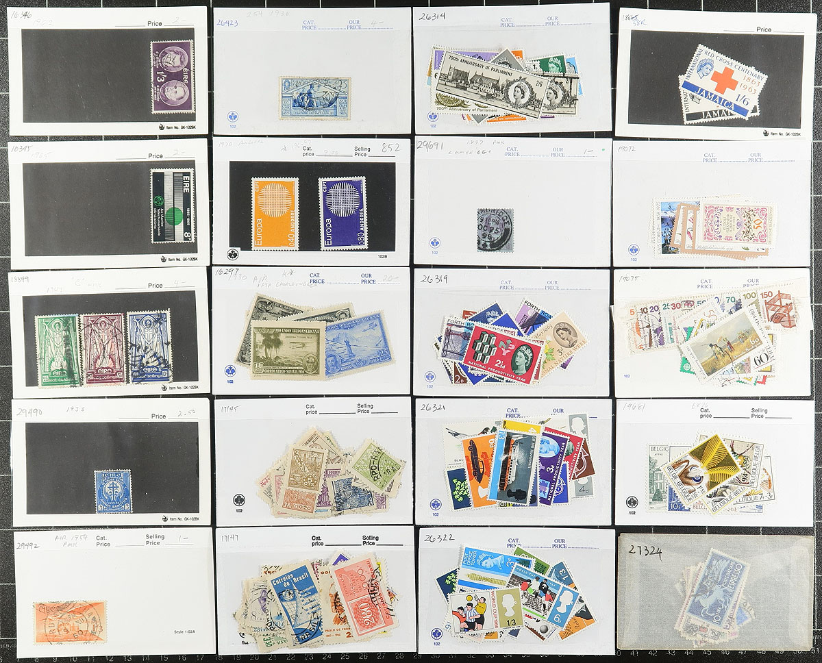 Group of primarily used worldwide stamps in roughly 100x dealer "102" cards, containing most singles and a few sets, generally ranging from the 1880's to the 1970's. The lot contains countries mostly in Europe, Middle East, and South America, noting France, Brazil, Germany, Iran, and some stamps from the United States. Most of the cards have been priced ranging from $2 to $20 per card, with a total retail value at $462 (roughly 80% of the cards have been priced). A nice lot for the worldwide collector. Estimate =