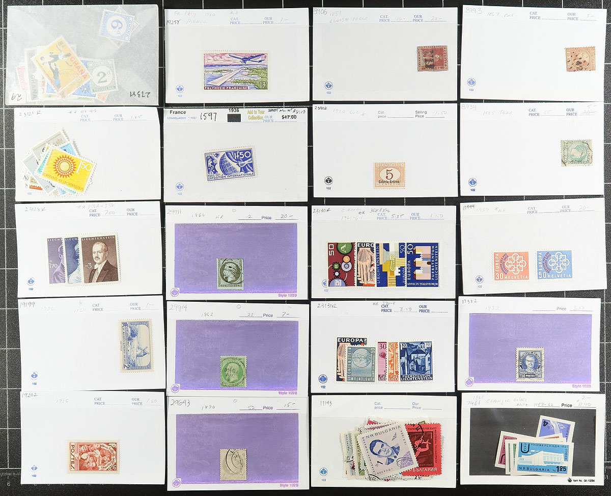 Group of primarily used worldwide stamps in roughly 100x dealer "102" cards, containing most singles and a few sets, generally ranging from the 1880's to the 1970's. The lot contains countries mostly in Europe, Middle East, and South America, noting France, Brazil, Germany, Iran, and some stamps from the United States. Most of the cards have been priced ranging from $2 to $20 per card, with a total retail value at $462 (roughly 80% of the cards have been priced). A nice lot for the worldwide collector. Estimate =
