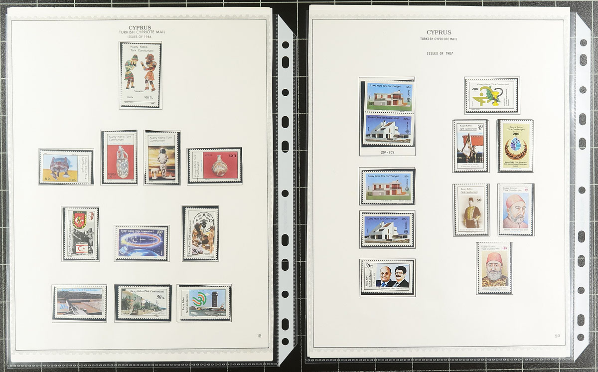 Nice collection of mint Northern Cyprus, 1974-1989, containing a few hundred stamps nicely organized in hingeless mounts on Minkus album pages. The collection ranges from Scott #1/251 (99% complete in period), containing sets and a few souvenir sheets noting a few better with #s 1-7 (c.v. $89.75 total), 127 souvenir sheet ($60), along with a few items ranging from $5 to $10. 2026 Scott US$376.15 =