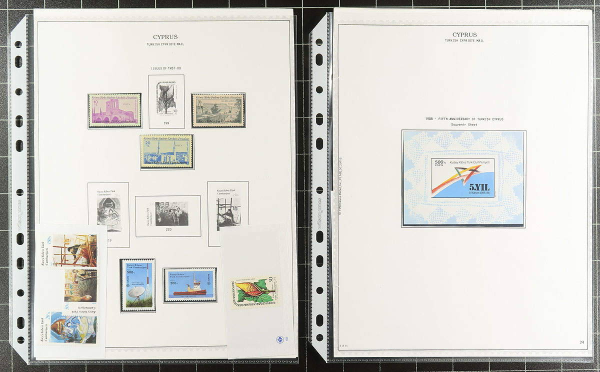 Nice collection of mint Northern Cyprus, 1974-1989, containing a few hundred stamps nicely organized in hingeless mounts on Minkus album pages. The collection ranges from Scott #1/251 (99% complete in period), containing sets and a few souvenir sheets noting a few better with #s 1-7 (c.v. $89.75 total), 127 souvenir sheet ($60), along with a few items ranging from $5 to $10. 2026 Scott US$376.15 =