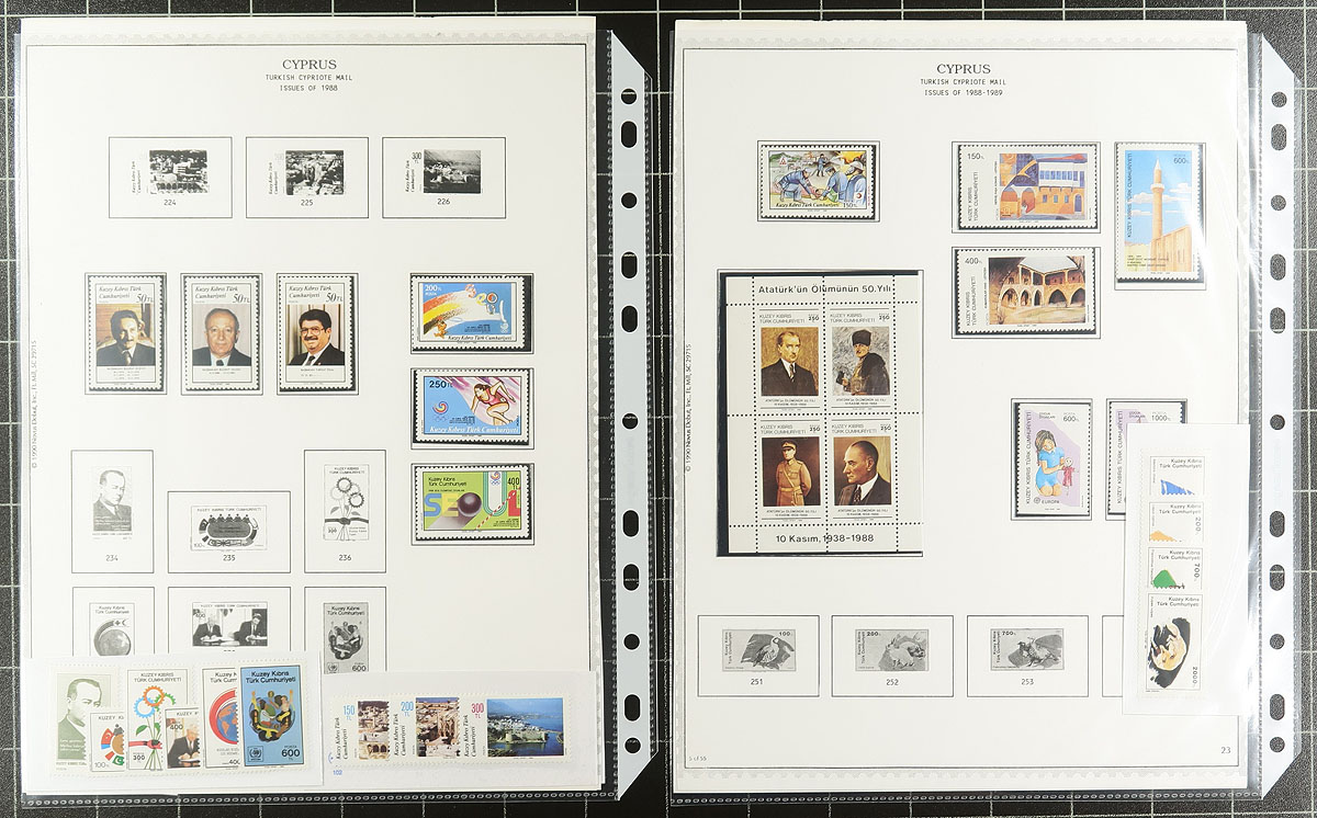Nice collection of mint Northern Cyprus, 1974-1989, containing a few hundred stamps nicely organized in hingeless mounts on Minkus album pages. The collection ranges from Scott #1/251 (99% complete in period), containing sets and a few souvenir sheets noting a few better with #s 1-7 (c.v. $89.75 total), 127 souvenir sheet ($60), along with a few items ranging from $5 to $10. 2026 Scott US$376.15 =