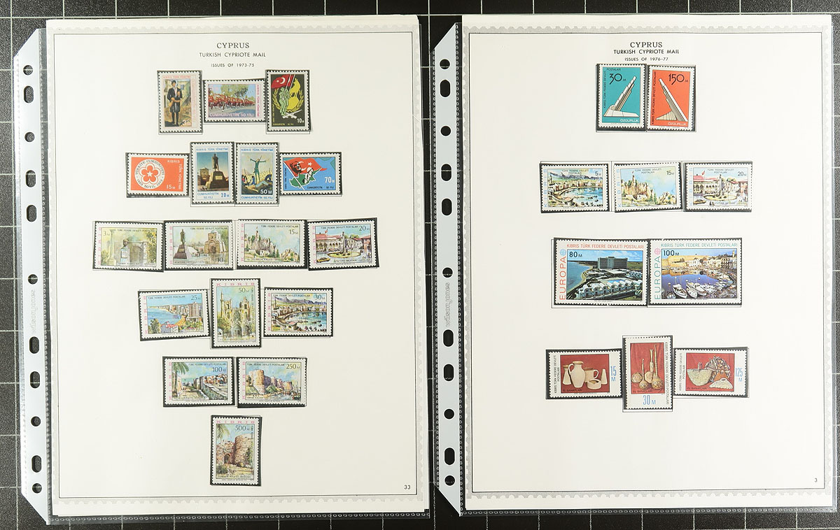 Nice collection of mint Northern Cyprus, 1974-1989, containing a few hundred stamps nicely organized in hingeless mounts on Minkus album pages. The collection ranges from Scott #1/251 (99% complete in period), containing sets and a few souvenir sheets noting a few better with #s 1-7 (c.v. $89.75 total), 127 souvenir sheet ($60), along with a few items ranging from $5 to $10. 2026 Scott US$376.15 =