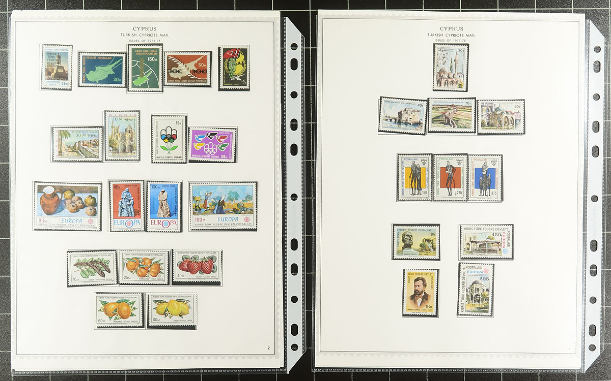 Nice collection of mint Northern Cyprus, 1974-1989, containing a few hundred stamps nicely organized in hingeless mounts on Minkus album pages. The collection ranges from Scott #1/251 (99% complete in period), containing sets and a few souvenir sheets noting a few better with #s 1-7 (c.v. $89.75 total), 127 souvenir sheet ($60), along with a few items ranging from $5 to $10. 2026 Scott US$376.15 =