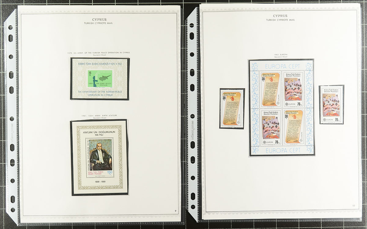 Nice collection of mint Northern Cyprus, 1974-1989, containing a few hundred stamps nicely organized in hingeless mounts on Minkus album pages. The collection ranges from Scott #1/251 (99% complete in period), containing sets and a few souvenir sheets noting a few better with #s 1-7 (c.v. $89.75 total), 127 souvenir sheet ($60), along with a few items ranging from $5 to $10. 2026 Scott US$376.15 =