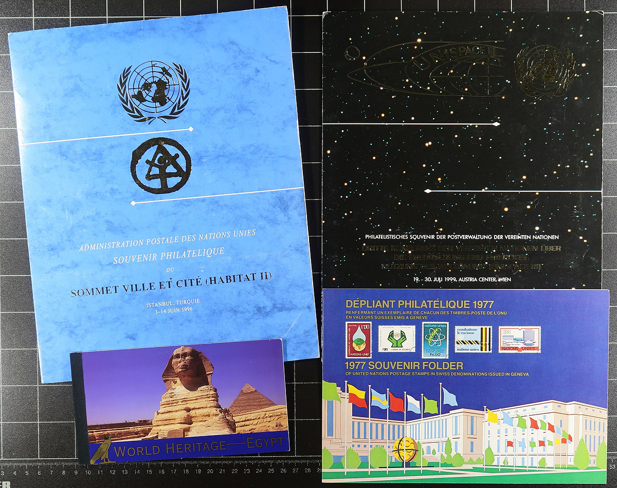 Collection / accumulation of never hinged United Nations, 1960's-1990's, containing a few hundred stamps in over 100 souvenir folders and annual collections. The lot includes material from all 3 offices, including a few sheetlets and panes, including material from the popular "Endangered Species", and other popular thematic and topical subjects. A nice lot for collectors and dealers alike. Estimate =