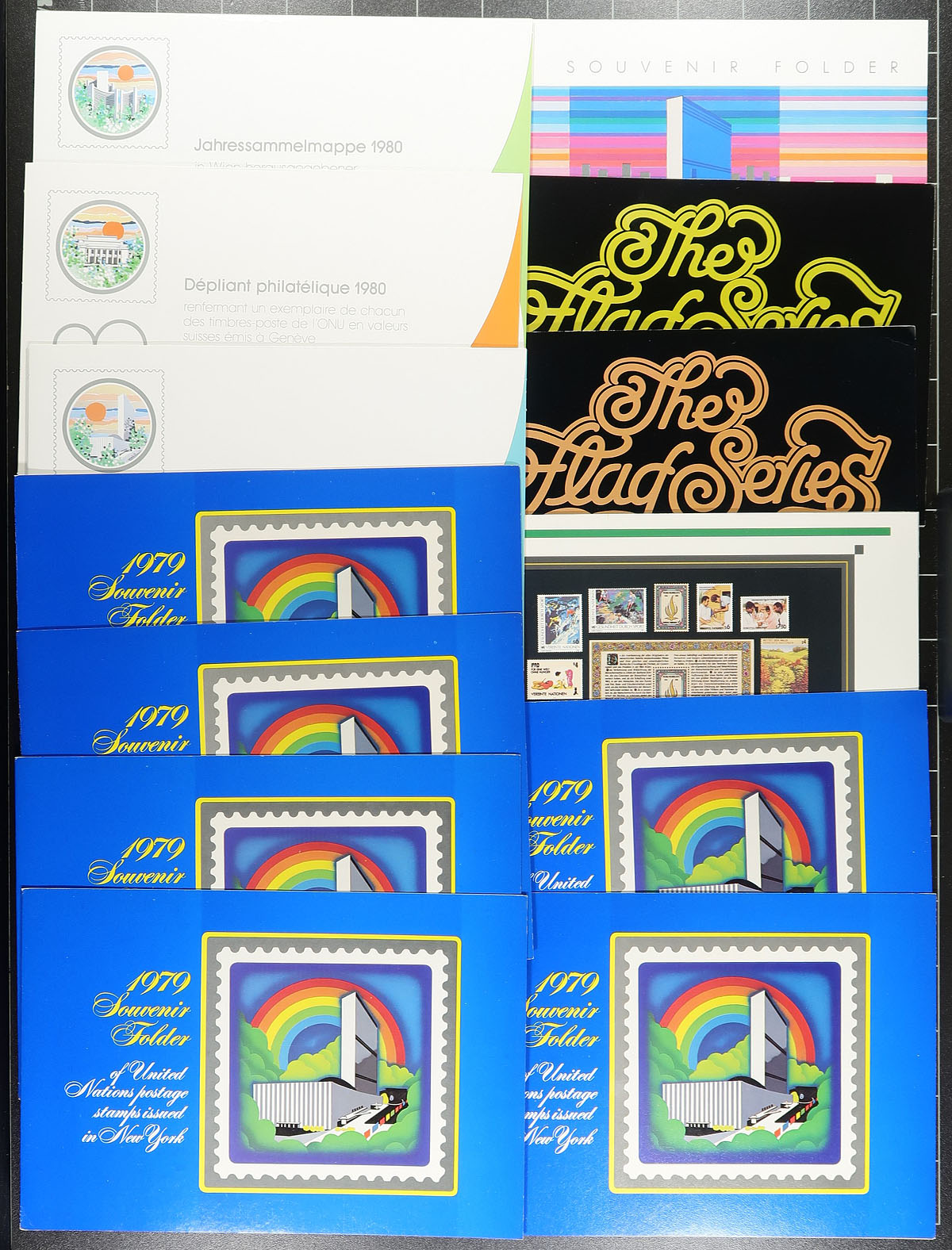 Collection / accumulation of never hinged United Nations, 1960's-1990's, containing a few hundred stamps in over 100 souvenir folders and annual collections. The lot includes material from all 3 offices, including a few sheetlets and panes, including material from the popular "Endangered Species", and other popular thematic and topical subjects. A nice lot for collectors and dealers alike. Estimate =