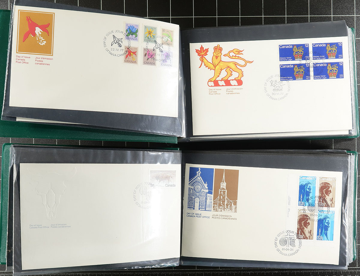 First Day Covers. Clean collection of roughly 550 first day covers, neatly organized in 6 Unisafe cover albums, 1977-1993. We note singles, sets, plate blocks, booklet panes, and high denomination frankings, with some covers cataloguing $5 and up each. A nice clean lot for collectors and dealers alike, with the albums retailing over $100 alone. Estimate =