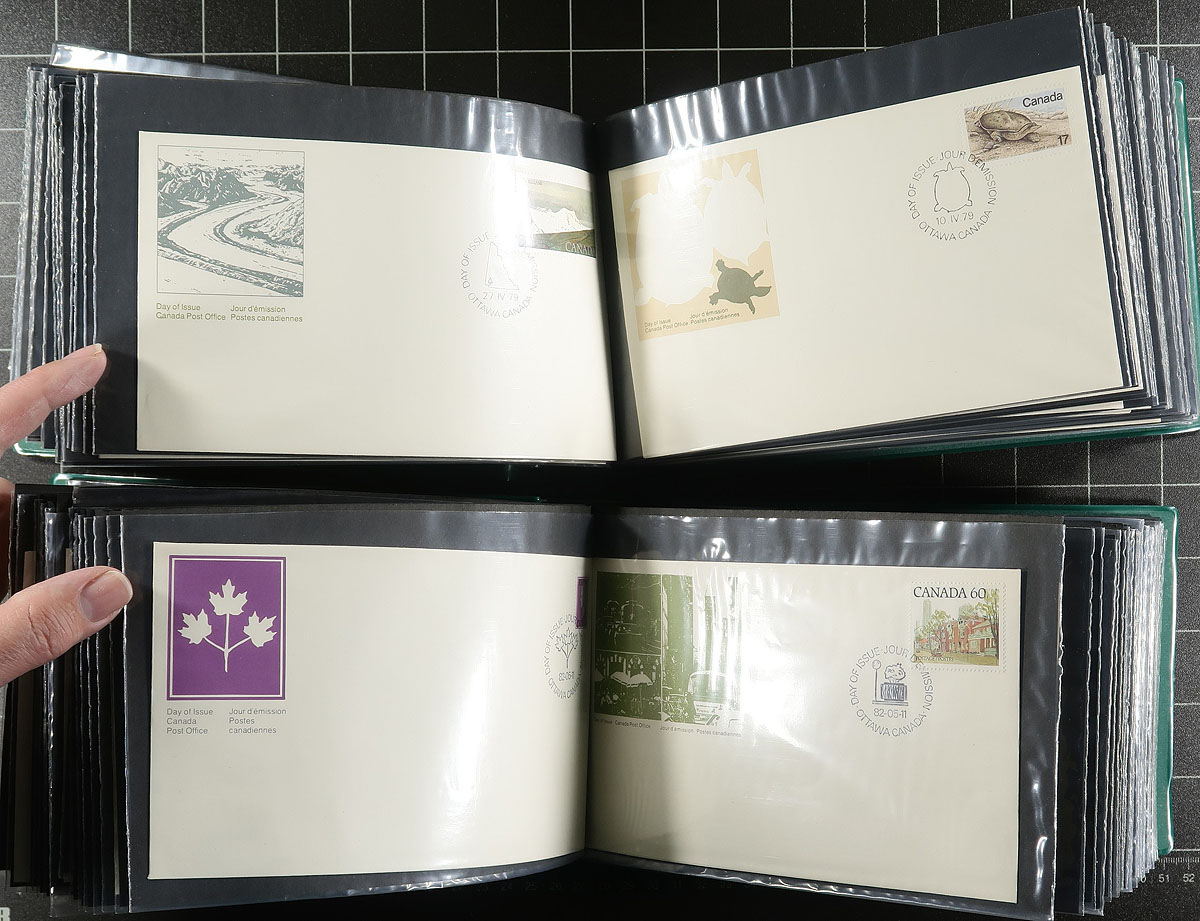 First Day Covers. Clean collection of roughly 550 first day covers, neatly organized in 6 Unisafe cover albums, 1977-1993. We note singles, sets, plate blocks, booklet panes, and high denomination frankings, with some covers cataloguing $5 and up each. A nice clean lot for collectors and dealers alike, with the albums retailing over $100 alone. Estimate =