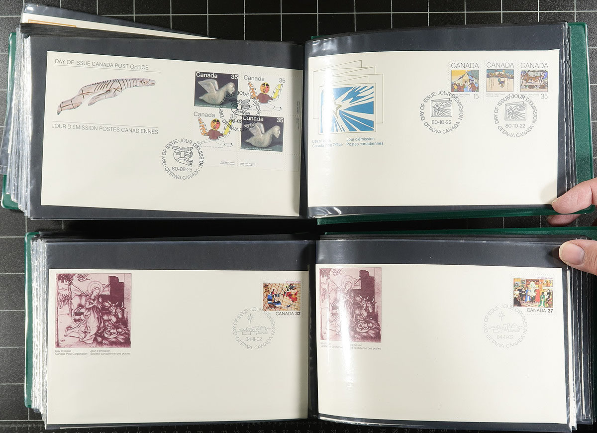 First Day Covers. Clean collection of roughly 550 first day covers, neatly organized in 6 Unisafe cover albums, 1977-1993. We note singles, sets, plate blocks, booklet panes, and high denomination frankings, with some covers cataloguing $5 and up each. A nice clean lot for collectors and dealers alike, with the albums retailing over $100 alone. Estimate =