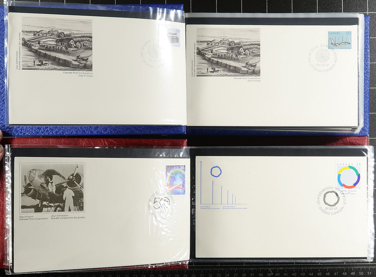 First Day Covers. Clean collection of roughly 550 first day covers, neatly organized in 6 Unisafe cover albums, 1977-1993. We note singles, sets, plate blocks, booklet panes, and high denomination frankings, with some covers cataloguing $5 and up each. A nice clean lot for collectors and dealers alike, with the albums retailing over $100 alone. Estimate =
