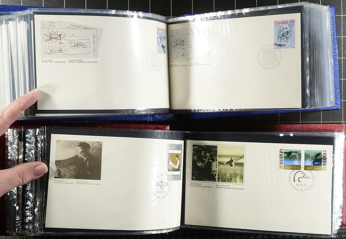First Day Covers. Clean collection of roughly 550 first day covers, neatly organized in 6 Unisafe cover albums, 1977-1993. We note singles, sets, plate blocks, booklet panes, and high denomination frankings, with some covers cataloguing $5 and up each. A nice clean lot for collectors and dealers alike, with the albums retailing over $100 alone. Estimate =