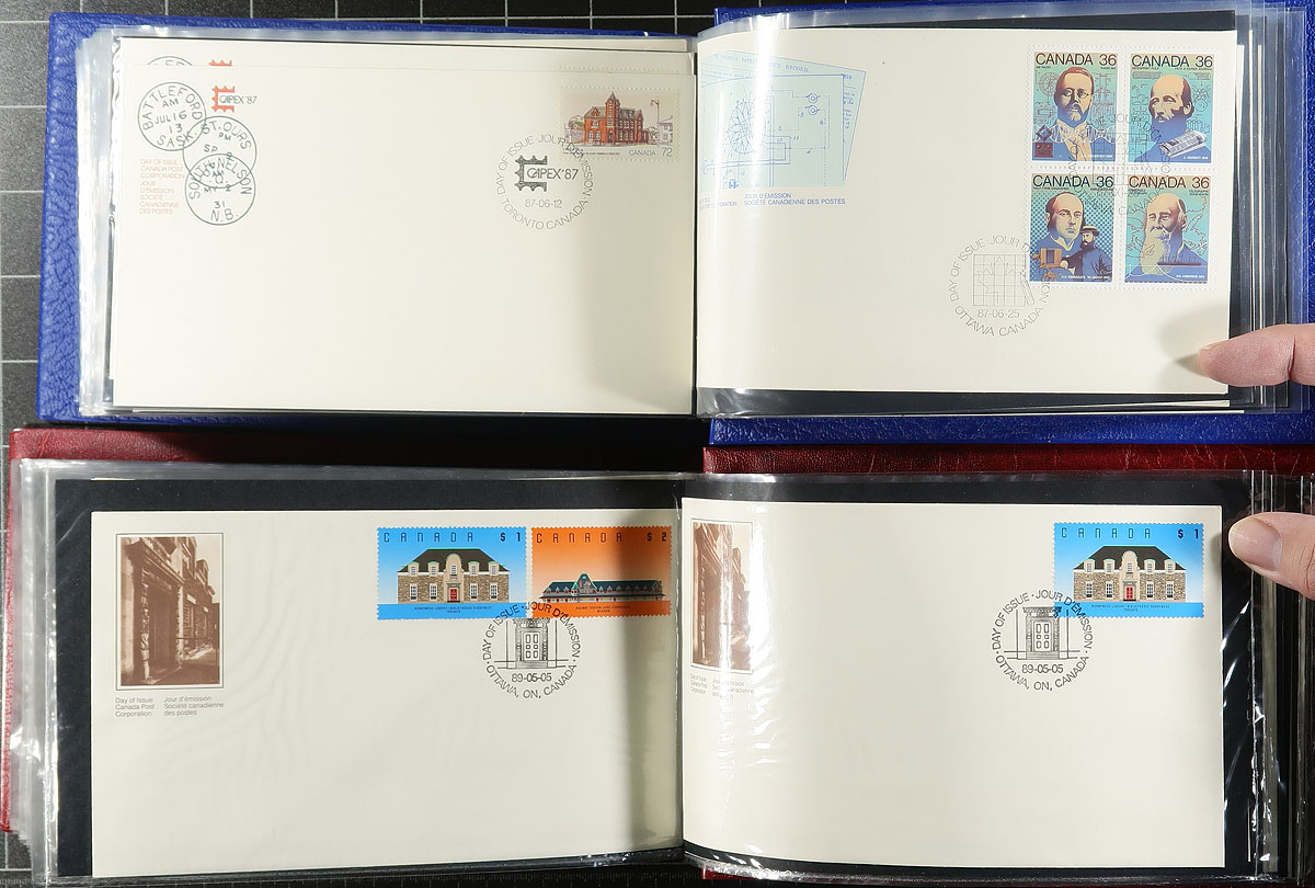First Day Covers. Clean collection of roughly 550 first day covers, neatly organized in 6 Unisafe cover albums, 1977-1993. We note singles, sets, plate blocks, booklet panes, and high denomination frankings, with some covers cataloguing $5 and up each. A nice clean lot for collectors and dealers alike, with the albums retailing over $100 alone. Estimate =